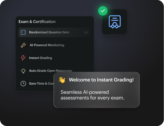 Deliver assessments securely at scale, online or offline. Advanced proctoring tools ensure academic integrity, while white-labeling keeps your institutional branding consistent, maintaining trust and compliance across every touchpoint.
